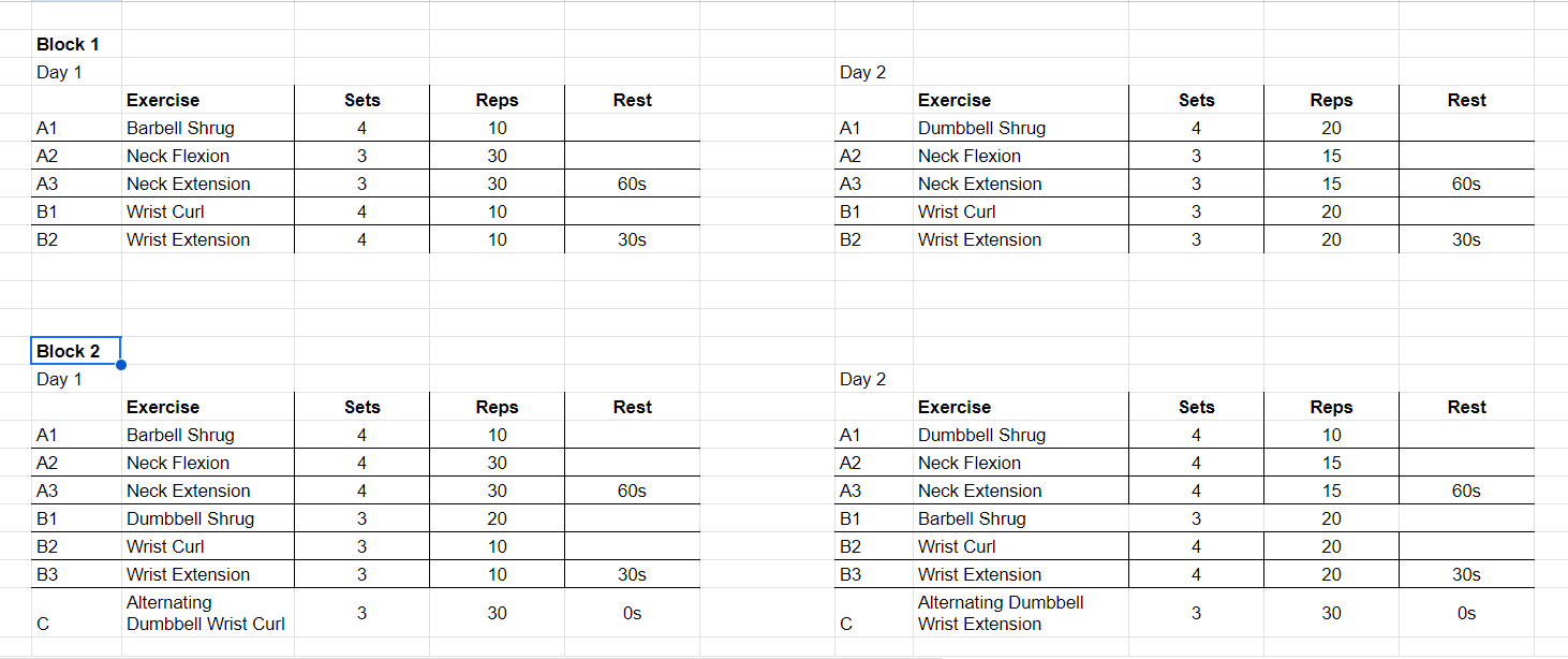 For the first workout, for each exercise pick a weight that’s tough but very doable. For difficulty, on a scale of one to ten, it should feel like a seven. Every exercise you’ll try to get all of the reps on all of the sets. If you fail to get any of the reps on any of the sets, you’ll repeat the weights on that exercise next time you do that workout. For example, if you’re supposed to do four sets of ten barbell shrugs and you get ten on the first three sets, but only eight on the last set, you’ll do the same weight next workout. If you succeed, you’ll increase the weight next workout. By increase, I don’t mean just throw a ton of weight. Add five pounds for dumbbell exercises, ten pounds for barbell. An exception is your neck work. Progress this very slowly. Do not go too heavy. Your neck is not built to carry hundreds of pounds or be loaded heavy quickly. Start too light, take your time, progress slowly. If you don’t, you will regret it. I did.